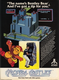 | DESCRIPTION | "The Name's Bentley Bear, and I've got a tip for you." Advertisement for the arcade game Crystal Castles, by Atari, including hand-drawn Bentley (you can see the marker) and somewhat strange pose by overexcited arcade player. From the December 1983 issue of Electronic Games (1983) |