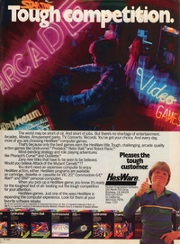 | DESCRIPTION | Tough Competition (Arcades): HesWare pleases the tough customer. Would you believe Attack of the Mutant Camels?? The world may be short of oil and jobs, this advertisement explains, but there's no shortage of entertainment. Shows a bunch of HesWare (Human Engineered Software) games, including Gridrunner, Predator, Retro Ball, Robot Panic, Synthesound, and Shamus. From the December 1983 issue of Electronic Games Magazine (1983) |