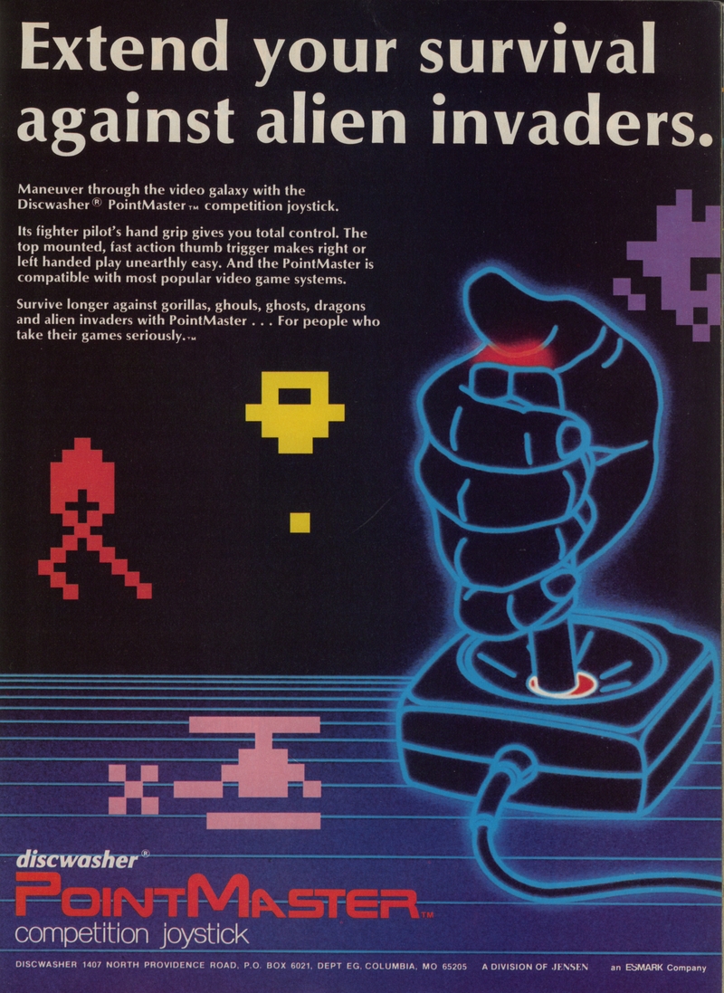 | DESCRIPTION | Extend your Survival Against Alien Invaders with the Discwasher Pointmaster Competition Joystick. Includes classic 1980s glowy image of a joystick and undefinited pixel invaders. From the December 1983 issue of Electronic Games magazine (1983) |