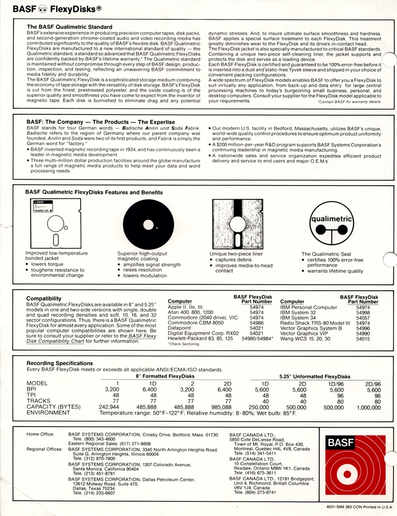 | DESCRIPTION | Binder-able fact sheet on BASF FlexyDisks (5 1/4" Floppy Disks) including information on the company, specifications, compatibility, and the "BASF Qualimetric Standard" (1983) |