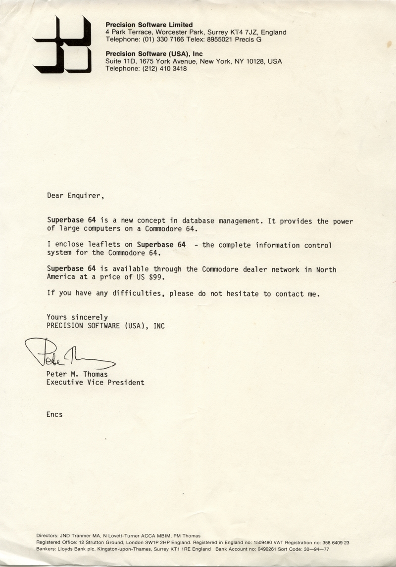 | DESCRIPTION | Cover letter and flyer for the Superbase 64 by Precision Software of Surrey and New York, the "new concept in database management / complete information system for the Commodore 64" (1983) |