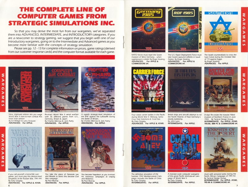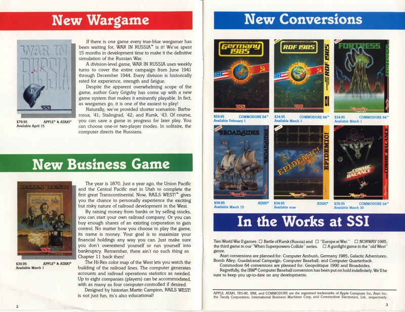 | DESCRIPTION | Spring 1984 Catalog for Strategic Simulations, Inc., a game company focused on turn-based games or simulations (with a branching out into arcade-style games as well) Originally a half-page booklet, scanned across to keep the visual look of the majority of catalog pages. (1984) |